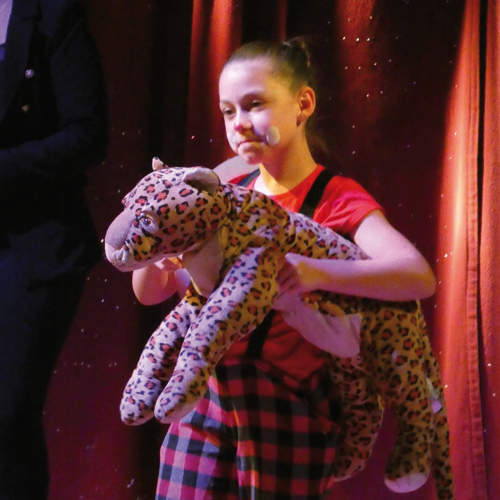 steht als Clown Paulina in der Manege. Mutig und spektakulär versucht sie sich als Domteur ihres Stoff-Leoparden 'Marcel' und zeigt in der Mit-Mach-Runde den anwesenden Kindern wie man jongliert.